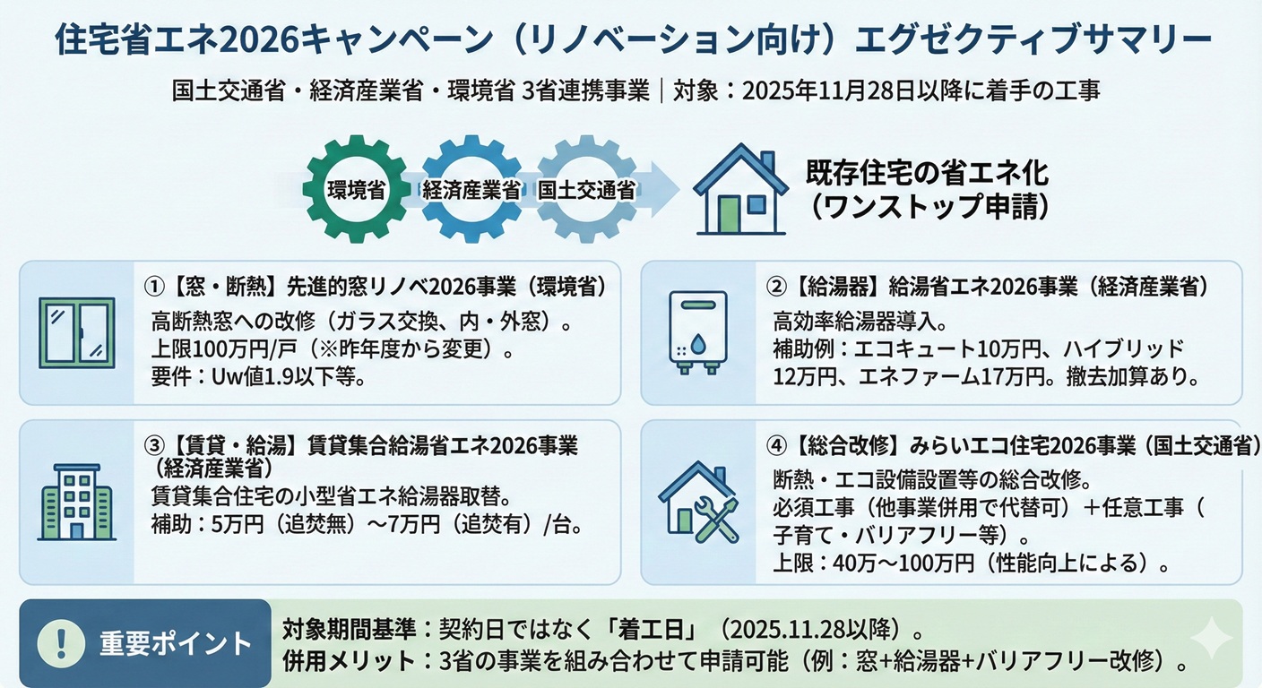 国交・経産・環境3省連携の「住宅省エネ2026キャンペーン」は、2025年11月28日以降に着工するリノベ工事が対象です。