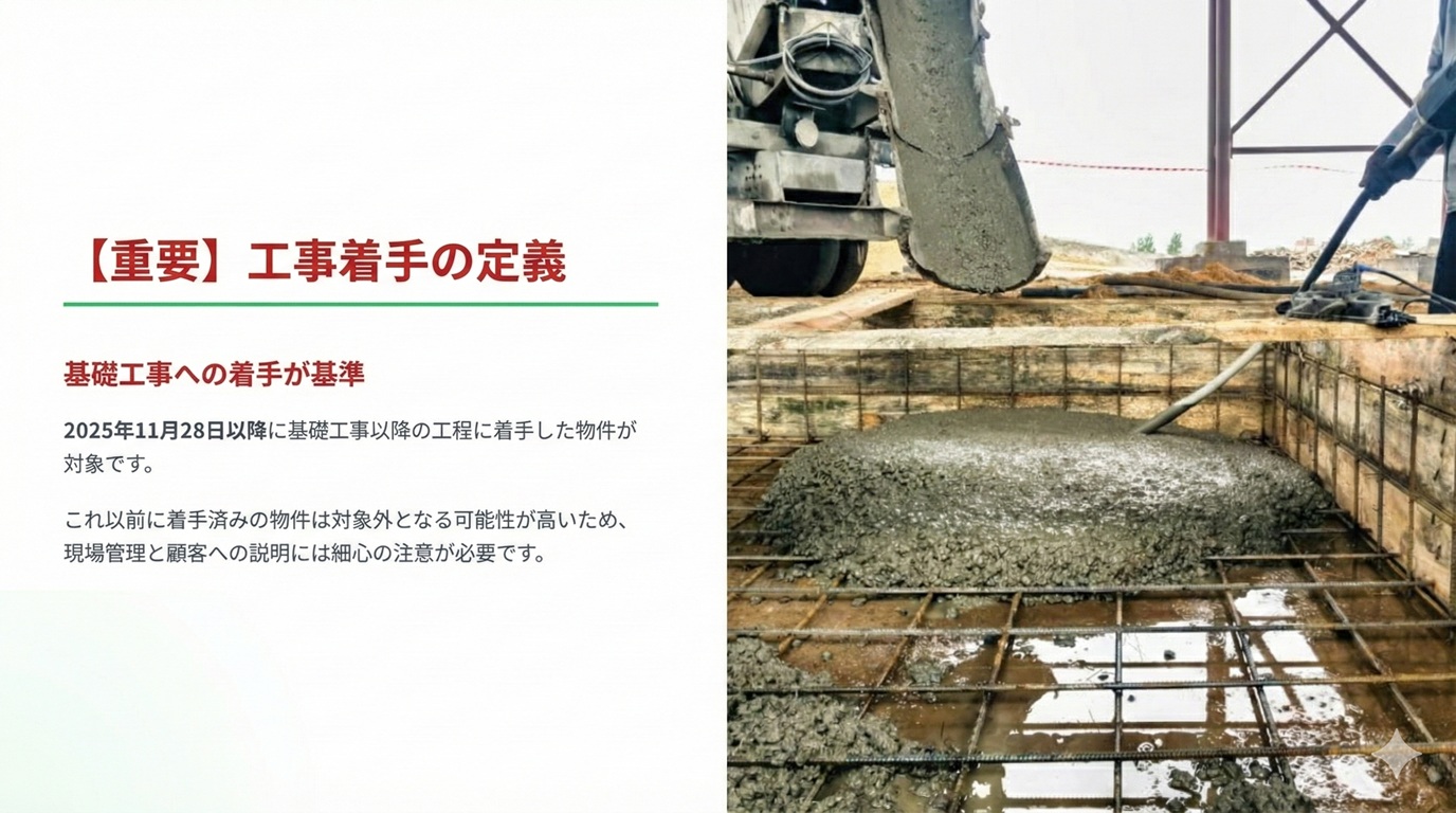 従来事業(子育てエコホーム等)では「基礎工事の次の工程」が基準でしたが、今回は新築において**「基礎工事そのものの着手」**が基準となります。