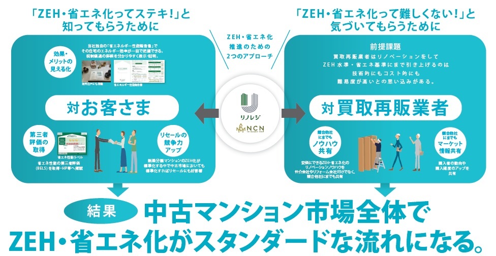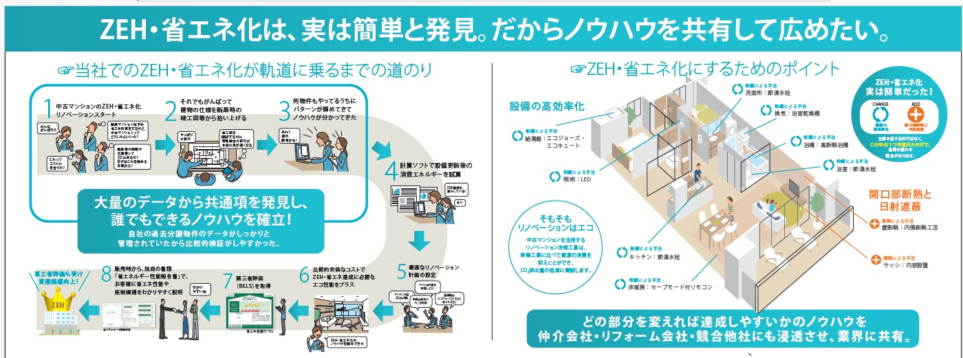 中古マンションを買取り、リノベーションを施して再販売する際に、必要な箇所に適切な省エネルギー設備等を導入することで、省エネ基準またはZEH水準を確保する取り組み。また、お客様にその性能をわかりやすく説明するための独自の「省エネルギー性能報告書」を発行。新築住宅では省エネ基準が必須となり、更にレベルが高い性能のZEH水準に移りつつある。ZEHとは住宅で消費するエネルギーをゼロ以下にしようとするもの。