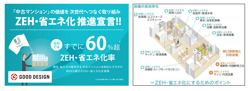 中古マンションを買い取り、リノベーションを施して再販売する際に、必要な箇所に適切な省エネルギー設備等を導入し、ZEH水準または省エネ基準の達成を目指します。両社が連携したことで、これまで難しいとされていた中古マンションのZEH水準や省エネ基準の達成が容易になり、省エネ性能を備えた物件の供給がスムーズに行えるようになりました。また、これまで新築マンションと比較して省エネに関する情報が少なかった中古マンションの購入検討者にとって、省エネ性能が表示された物件を選べるようになったことは大きなメリットとなります。両社はこの取り組みを中古市場全体に広げ、持続的な社会の実現に貢献してまいります。