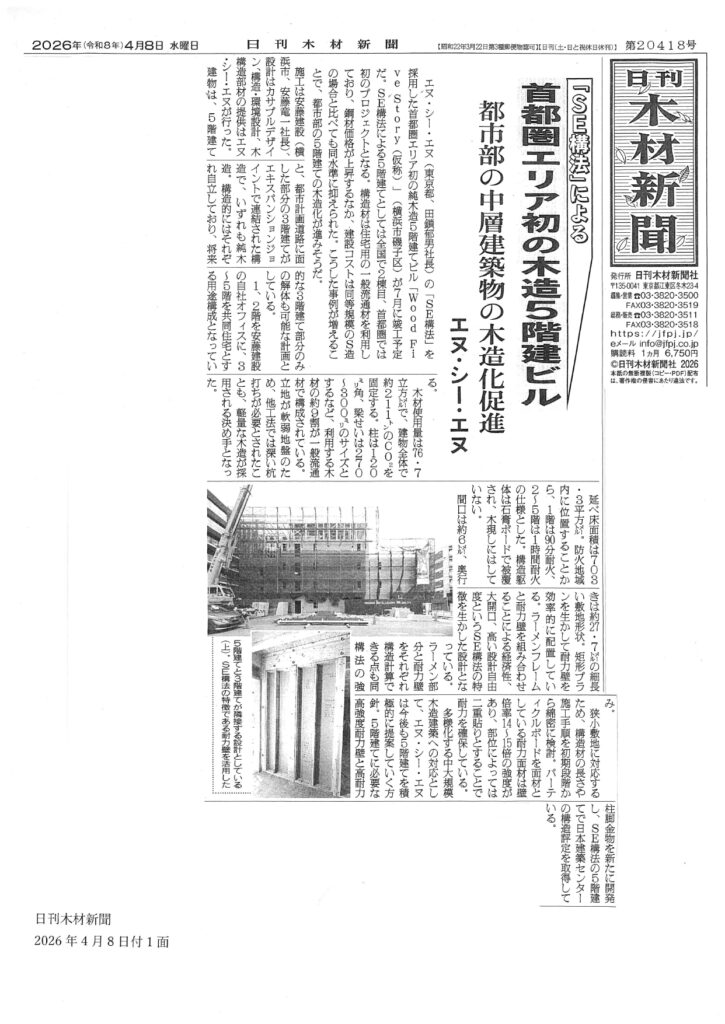 2026/04/14メディア掲載 「日刊木材新聞」(2026年4月8日)|「SE構法」による首都圏エリア初の木造5階建ビル コスモスイニシアの「ZEH水準・省エネ基準」取得率37%達成! エヌ・シー・エヌの『高度な省エネルギー設計』をマンションリノベーションに活用 既存マンションを「環境にやさしい快適な住まい」へエヌ・シー・エヌ、SE構法による約1,800㎡の大規模木造店舗・完成見学会を5月8日に京都で開催 最大7mスパンの大空間、「SE構法」2件目の延焼防止建築物、『ZEB』を実現する木造トータルソリューションを公開 一覧に戻る