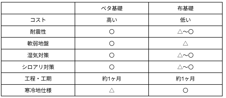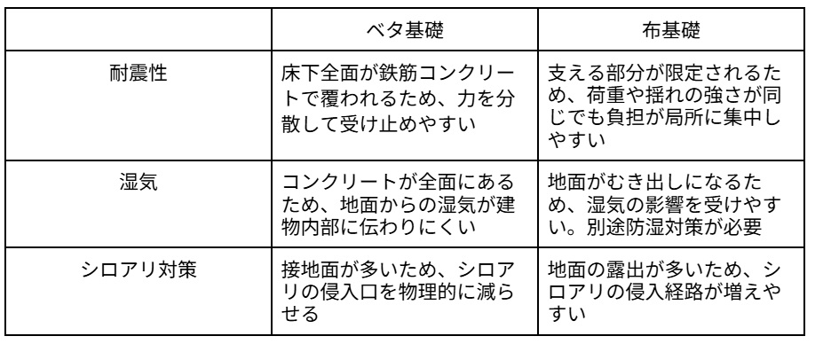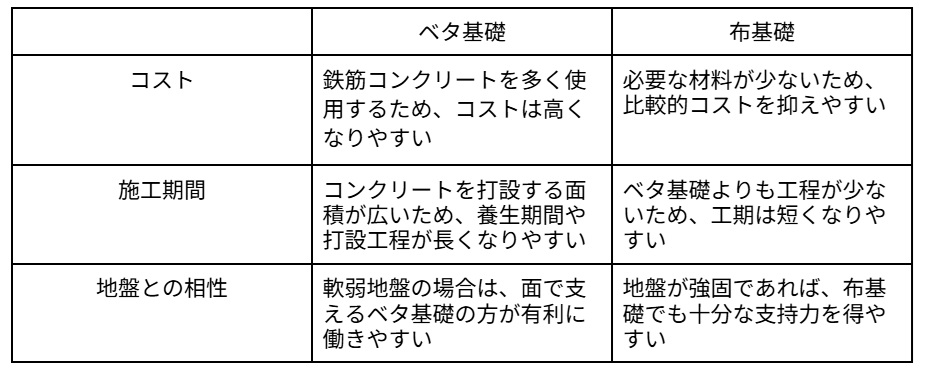 ベタ基礎と布基礎の特徴を述べたところで、違いを一覧で比較してみましょう。