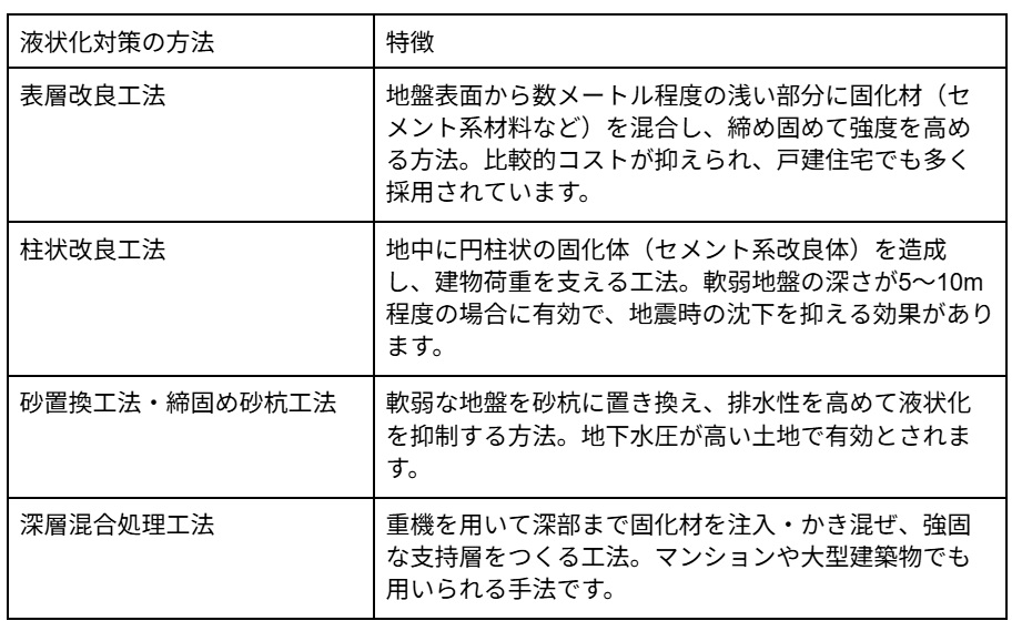 液状化を防ぐには、地盤そのものを改良する方法と、建物の構造で被害を抑える方法の2つを組み合わせることが効果的です。ここでは、それぞれの特徴を解説します。