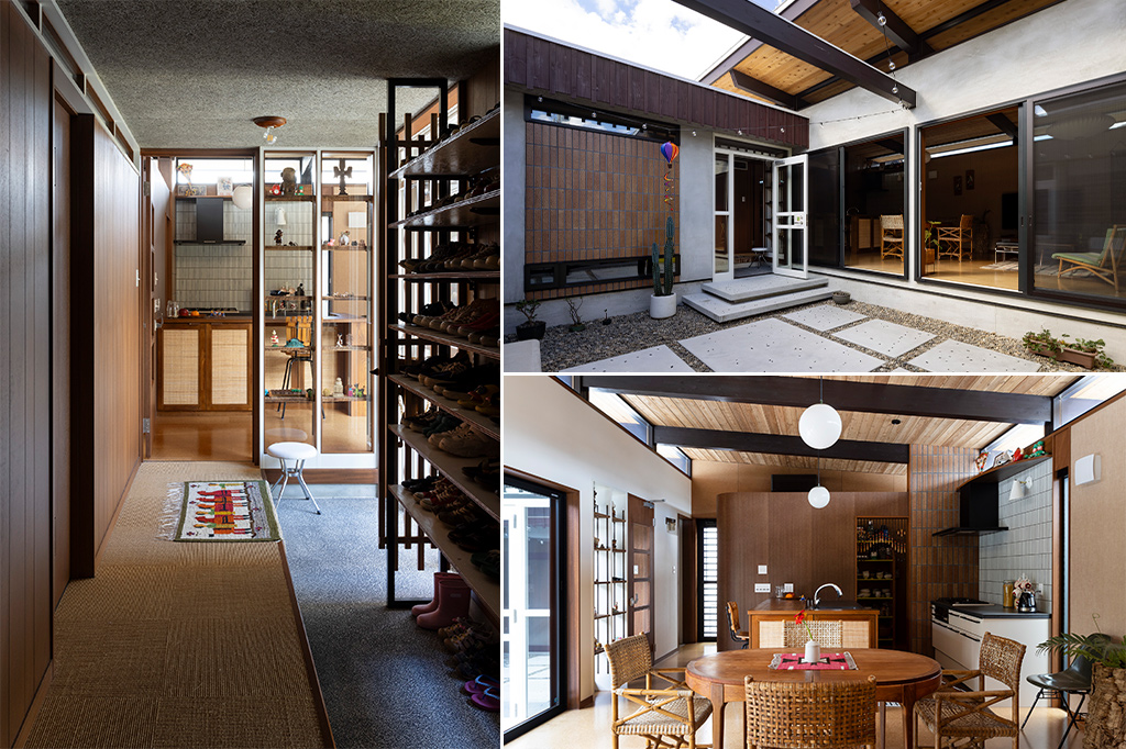 東側の道路から敷地へ入り、向かって左側がインナーガレージ、中央のガラス戸付きのドアを入ると中庭を経て玄関に至る。この玄関アプローチを兼ねた中庭を囲むように和室とLDKが配置され、窓からおだやかな光と風が取り込める仕様だ。平屋だが天井は高く開放的で、和室を除いた各部屋には高窓が設けられている。深い色合いの木が主役となった躯体や建具は、独特なレトロな味わいがある一方で、広々とした柱のないLDKは、現代の構造技術であるSE構法で実現したものだ。この住まいは、デザインのビジョンを細部まで具現化するうえで、SE構法がいかに有効かを示す好例であり、同構法は具体的な住宅イメージを持つ施主にとって、理想の形を叶える手段となることを示している。