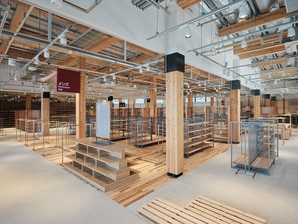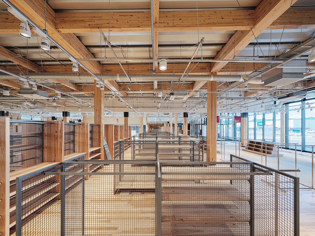店内は柱と梁の構造躯体や配線器具などがあらわしとなり、まるで木々がそびえる森の中にいるよう。木造ならではの温もりと開放感のある空間が実現した。設計施工を担当したグループ会社のMUJI HOUSEが、2023年に農林水産省と「木材利用拡大に関する建築物木材利用促進協定」を結んでおり、その理念が反映された形である。