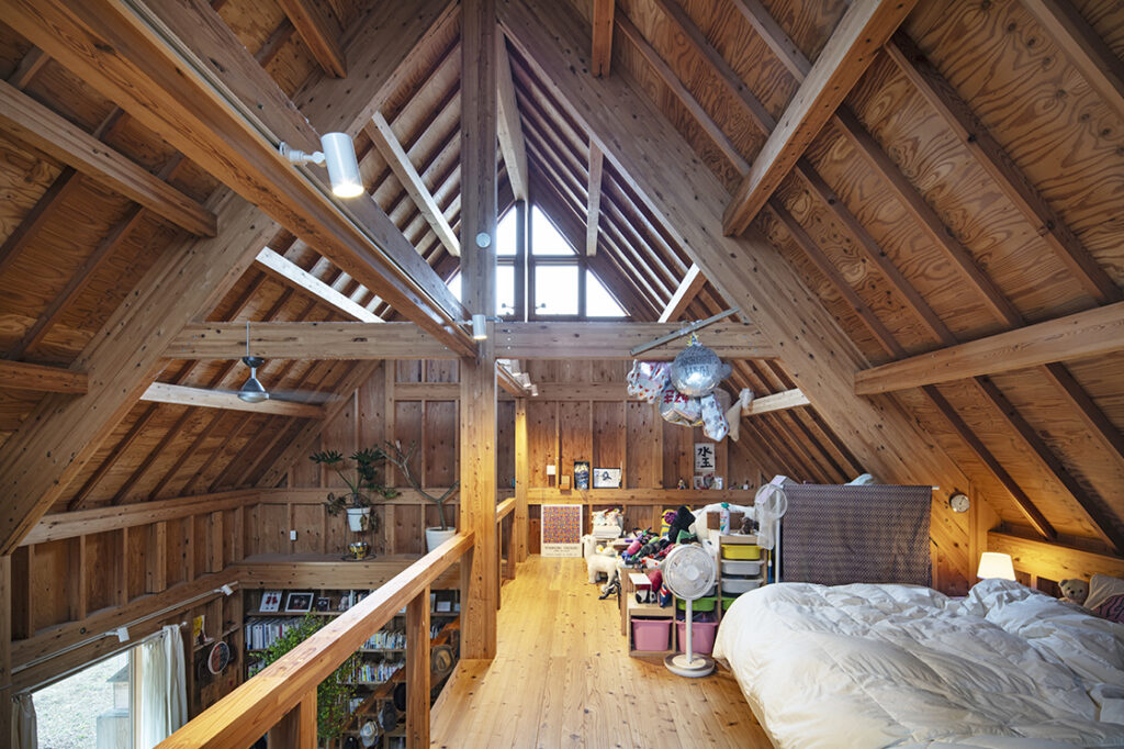 室内は、柱や梁があらわしとなっていて、大きな三角屋根の形がそのまま内部空間を形作っており、水回り以外は縦空間も含めたワンフロアだ。この形はオーナーであるTさんの「なにもない体育館みたいな家がいい」という要望を叶えたものであり、建築士の”住み手が自力で内部空間を作り上げていく営み”を推奨する思想がうまく重なって生まれた。