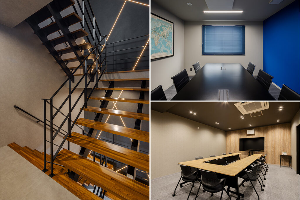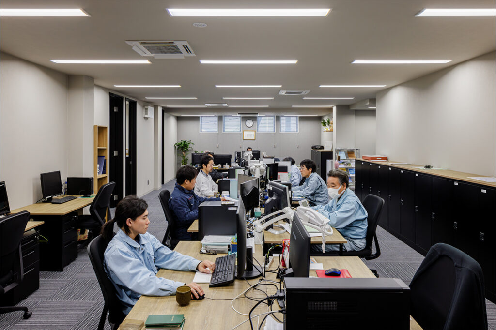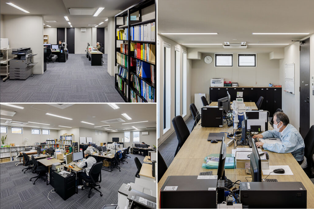 事務所には3社のグループ会社が入っているため、2階と3階は各社の規模に応じて空間が仕切られている。2階は大小の個室で構成されているが、建物の構造を支える耐力壁は、できる限り外周部や水回りに集約させている。よって、内部の仕切り壁は必要に応じて取り外すことができ、間取りが変えられるようになっている。3階の中心には共有の会議室を配置し、今後はそこを拠点にグループ会社同士の交流が深まっていくことが期待されている。