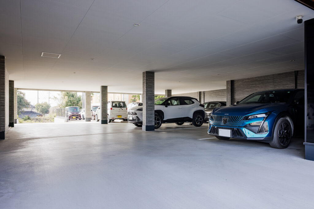 立地の特性上、全社員は車で通勤するため、人数分の駐車スペースが必要だった。そこで、露天の駐車場のほか、ビルの1階をピロティとすることで、合計12台を収容可能とした。