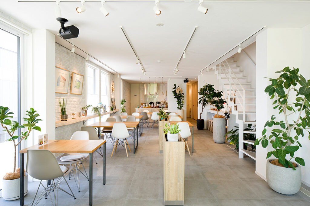 1階には、発酵食材を用いたメニューを提供する「Koso café colline」が入っている。設計事務所への来客は、カフェ奥の階段から2階へ上がる動線となっており、一方でカフェを訪れた客は、上階に設計事務所があると知る空間計画となっているため、双方の事業を伝え合う場となっている。